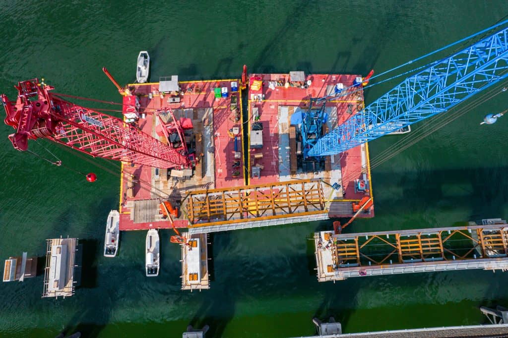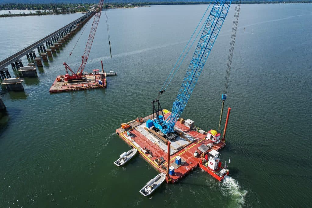 Ames Construction from Burnsville, MN recently performed this complex pick using 2 cranes. Each crane was a Manitowoc 2250 300 Ton Crane, sitting on platforms of Poseidon P2 7ft barges. The picks were a success and Poseidon Barge, LTD is proud to have been a part of it!