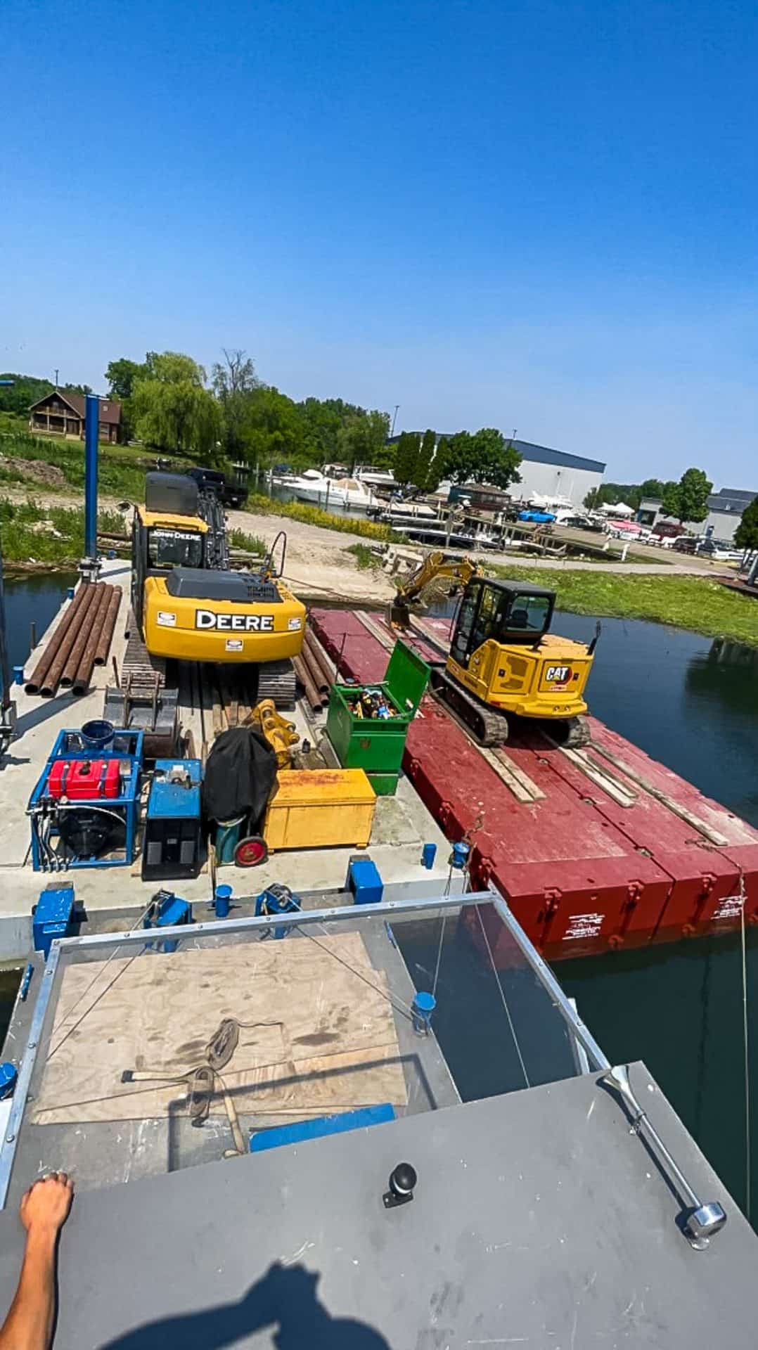 Poseidon was able to offer the P1Narrow model sectional barge. Each section comes in 30ftx7.5ftx4ft or 15ftx7.5ftx4ft. It was determined that a 15’ wide x 37.5’ x 4’ platform would work perfectly for their needs. This platform allowed KBE the access they need to leave their Algonac, MI customer happy and satisfied.