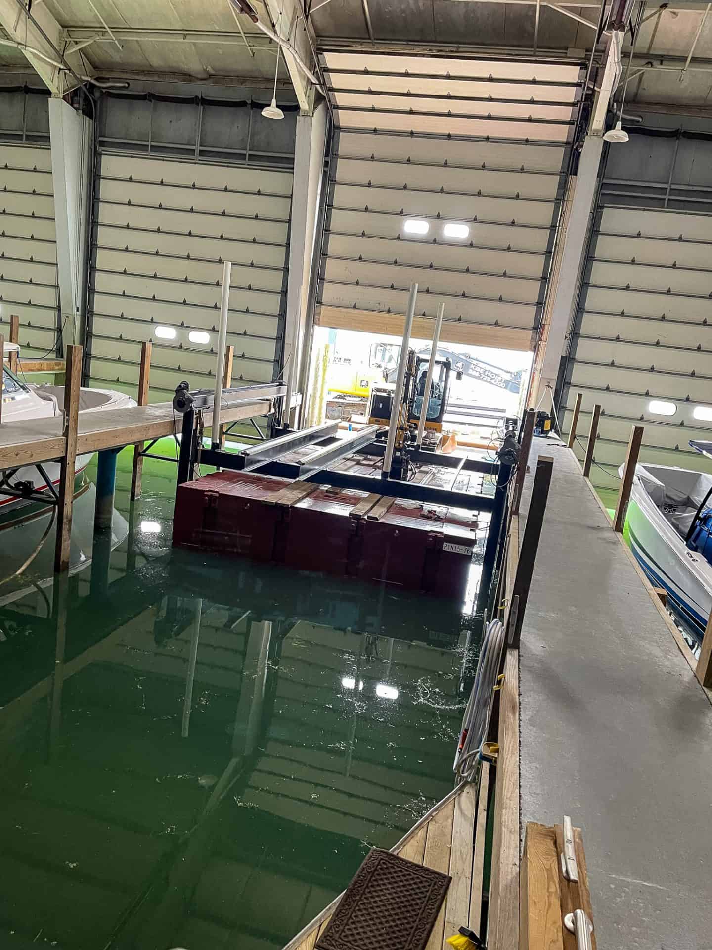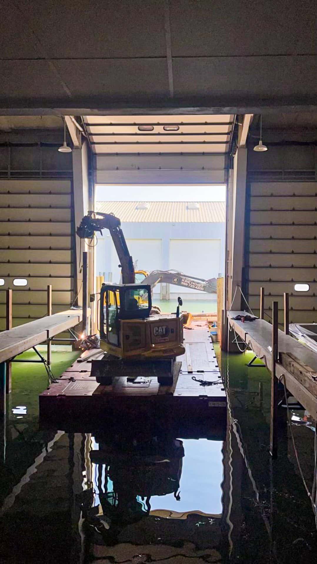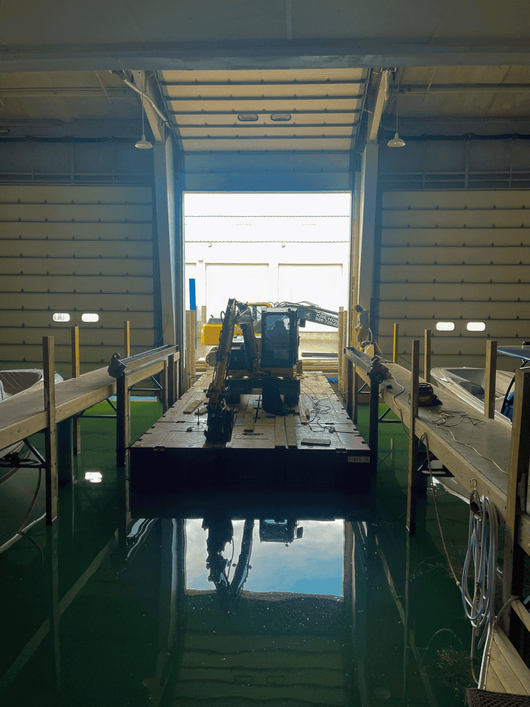 KBE Hoist and Fabrication specializes in building and installing steel boat lifts and repairing boat houses. Recently they were confronted with limited space between boat slips when repairing a customer boat house. KBE contacted Poseidon Barge looking for a solution that could fit within the boat slips while supporting a mini excavator they needed to complete the repairs.